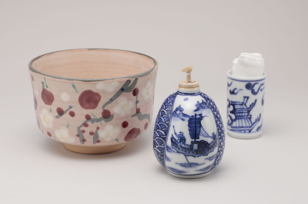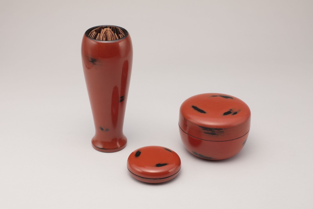 根来塗茶箱・紅白梅文茶碗・根来塗平棗・茶筅筒・香合・茶杓・祥瑞写振出・雲堂手茶巾筒